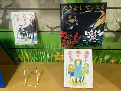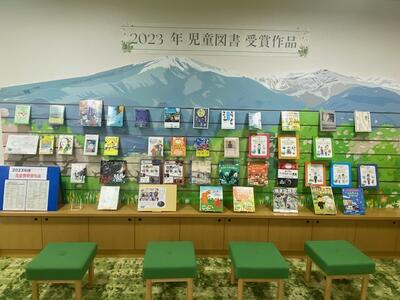 2023年児童図書受賞作品の本がずらりと並んでいます。