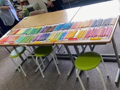 夏をテーマに、指(筆の代わりに)や鼻(香り)、目(500色の色鉛筆を使って)をはじめとした五感をフルに使って楽しく創作活動を行いました。