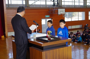 12月22日に第2学期終業式を行いました。校長式辞では、2学期始業式で話した「本を読もう」「あきらめずに取り組もう」「あいさつをしよう」についてのまとめの話をしました。読書につきましては、ぜひ冬休みにたくさん本を読んでほしいと思います。また、冬休みの過ごし方として、「お家の人とたくさん話そう」と、よびかけました。ぜひ、お子さんの夢や目標などについて語り合っていただきたいと思います。