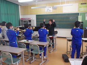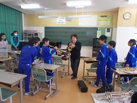 1月30日に、トランペッターのNobyさんから鼓笛のトランペット指導をしていただきました。まずは、マウスピースで音を出すとことが大切なこと、遊び感覚でいいから好きな曲でマウスピースだけで音を出してみることなどを教えていただきました。