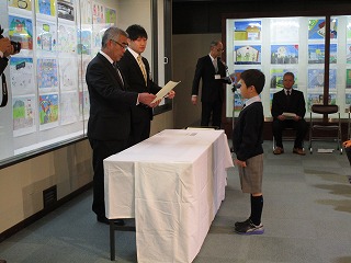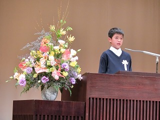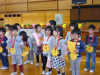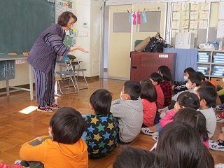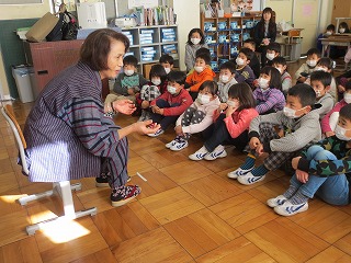 1年生は、かすりの着物姿の伊藤豊子さんから、「すずめの話」「おしょうさんの話」「おむすびころりんの話」を、本宮の言葉でじっくり聞かせていただきました。