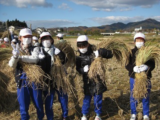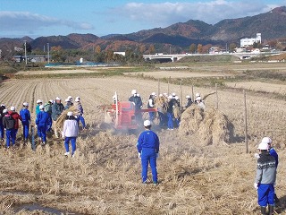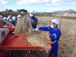 11月16日(木)5年生38名は、学区内の後藤勇さんの指導を受け、脱穀体験を行いました。(5月20日:田植え、10月5日:稲刈り)