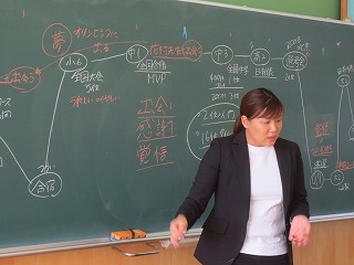 加藤和さんから、「出会い」「感謝」「覚悟」のキーワードで、夢の実現についての体験を聞きました。そのあと、子どもたちも、自分の将来の夢を考えました。
