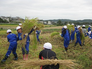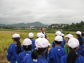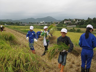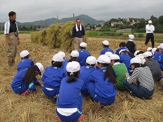 10月5日(水)、5年生38名は、学区の後藤勇さんの指導を受け、5月20日に田植えをした仁井田の田んぼで稲刈りをしました。11月には脱穀を体験し、美味しいコシヒカリを収穫する予定です。