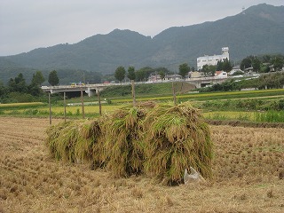 刈り取った稲は棒がけし、脱穀するまで天日で乾燥させます。