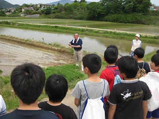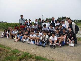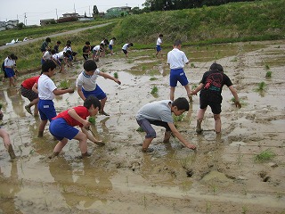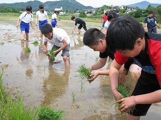 20日、5年生38名が、仁井田の田んぼで田植えをしました。