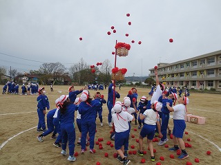 赤チーム、黄チーム、白チーム、青チームが、玉入れ・リレー・応援に一生懸命取り組んでいます。