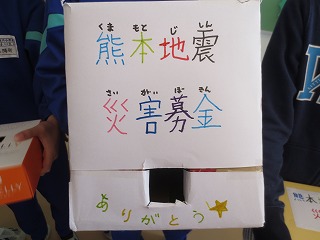 児童会では、テレビの報道で、まだ3万7千人も避難している人たちの中に、食べ物不足や寒さ・ケガで困っている人たちがいることを知り、少しでも力になろうと考え、「熊本地震災害に対する募金」を始めました。