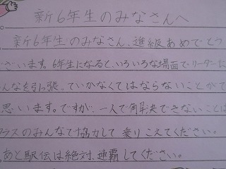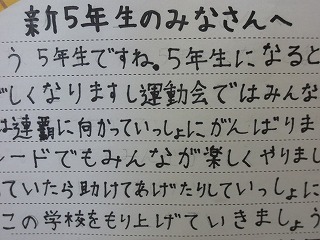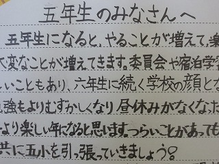 「やることが増えてきます。いっしょに学校を引っ張っていきましょう!」・・・5年生38名にも期待しています。