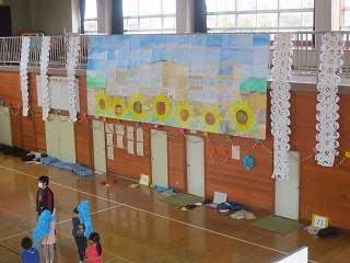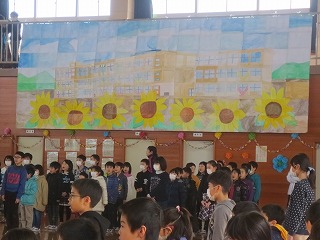 3月1日(火)、6年生を送る会と鼓笛移杖式が行われました。1年生から5年生までの224名が、6年生42名のために、心をこめて体育館を飾り、ひまわり班(縦割り班)で色紙を書き、学年毎にメッセージを送りました。