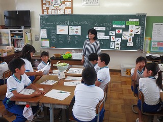 7月7日、給食センター武藤真紀先生においでいただき、4年生で食育「野菜のひみつを考えよう」の学習をしました。