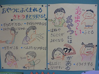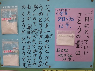 保健室の前には、砂糖のとり過ぎについて掲示があります。砂糖の取り過ぎは、むし歯、肥満などにもつながります。