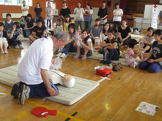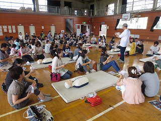 子どもたちの安全で楽しい夏休みのために、10日(木)には赤十字より講師を迎えて、救命救急法を開催しました。講師からは、一人で助けようとするのではなく、近くの人を呼んで複数で行うことが重要だと指導いただきました。(心肺蘇生・AED)