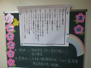 「リーダーとボスのちがい」が6年生の教室廊下に掲げられ、実行されています。