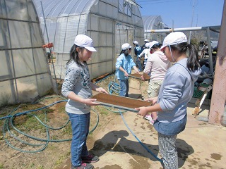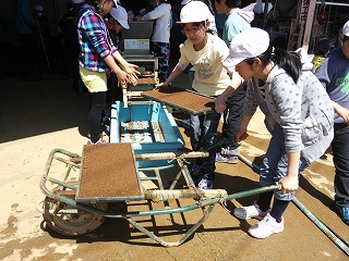 52名全員が、稲作りのスタートとなる苗床づくりと運搬を体験しました。今後は、「田植え」と「稲刈り」と「脱穀」を体験する予定です。