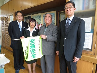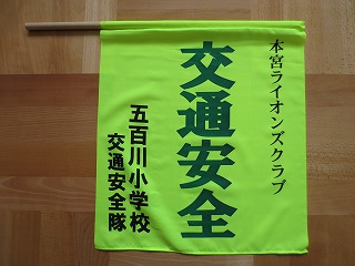 数年前に寄贈いただいた本宮ライオンズクラブに相談したところ、代表の渡辺さんと金子さんが来校され、新しい通学班旗を寄贈していただきました。