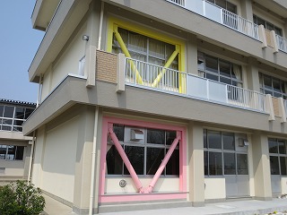 工事では、制震ブレース工法という耐震工法が取り入れられています。黄色とピンクと緑のブレースが鉄筋校舎を地震から守っています。