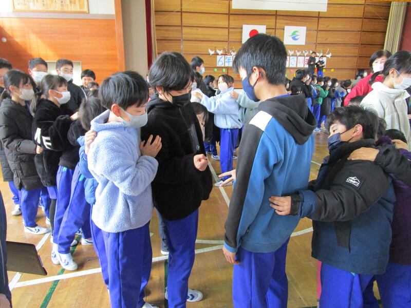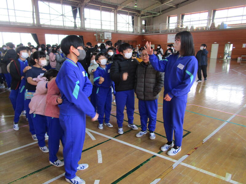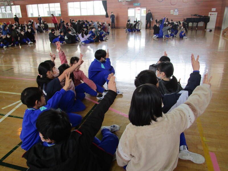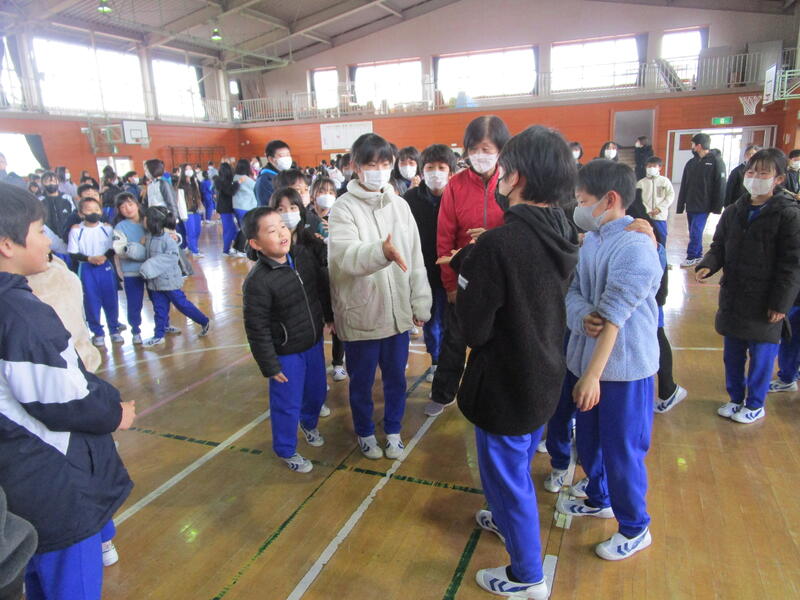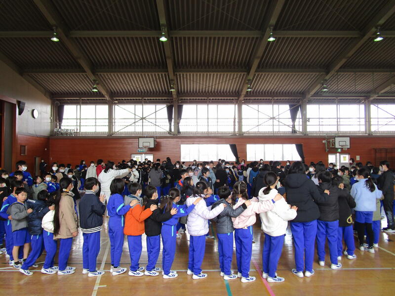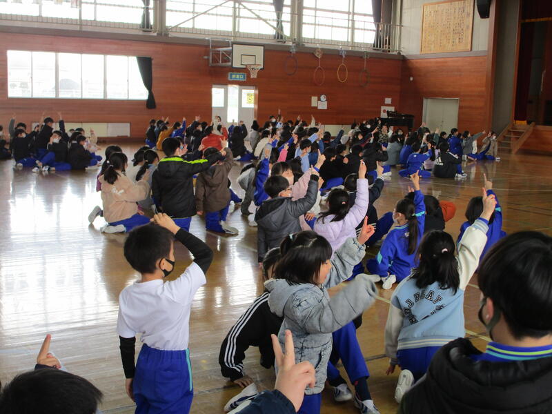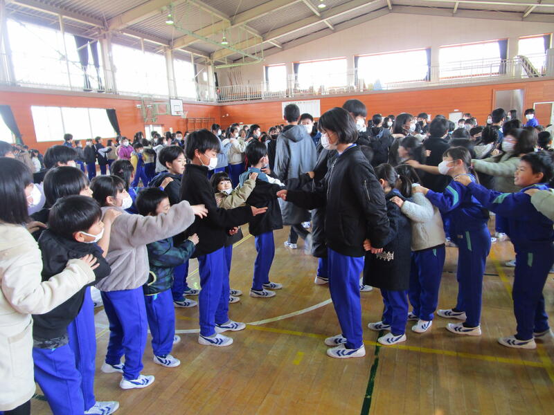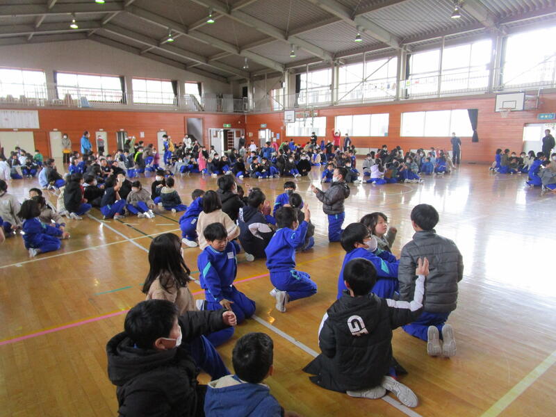 校長先生、児童代表のあいさつの後、全校でゲームをしました。