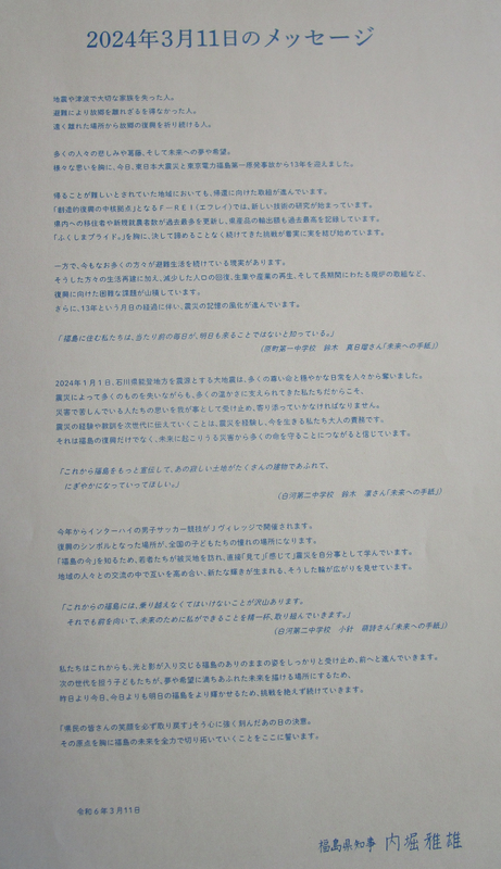 また、昼の放送では、校長先生が知事からのメッセージを読み上げ、東日本大震災にかかわるお話がありました。