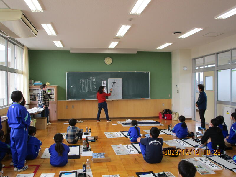 本日、3年生は、書写ボランティアの鈴木まり子先生とそのお弟子さんの橋本正子先生をお迎えして書き初めの授業を行いました。