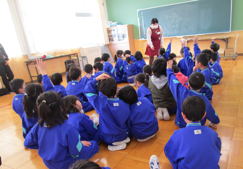 しらさわ夢図書館の館長さんがおいでになり、子どもたちに読書の楽しさを伝えるとともに読む力を引き出すような活動をしてくださいました。