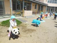 2歳児さんは動物やアンパンマンの遊具に乗り、揺れることを楽しんでいます。