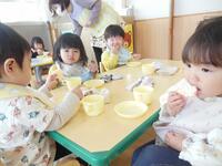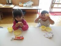 おやつは、鯉の形のお菓子を した『こいぽんせん』を食べました。初めての魚の形をしたお菓子に不思議そうな顔をしていたお友だちも一口食べてびっくり!