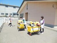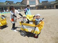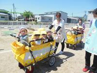 0歳児のお友だちは、手押し車に乗りみんなで先生のお部屋までお散歩です。幼稚園のお兄さん・お姉さんや、こいのぼりたちに興味津々です。