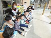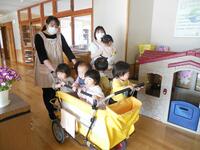 みんなで手押し車に乗ってお散歩に行きました。 泣いていたお友だちも泣き止んで、幼稚園のお兄さん・お姉さんに興味津々の様子でした。