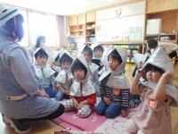 保育室に戻った後は、担任の先生から話を聞きながら、防災頭巾をかぶる練習をしました。