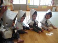 大切な頭を守る防災頭巾。みんな嫌がらずにかぶることができました。