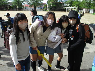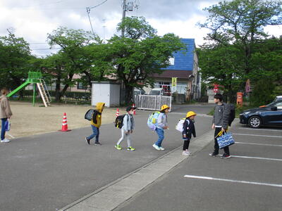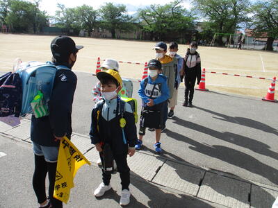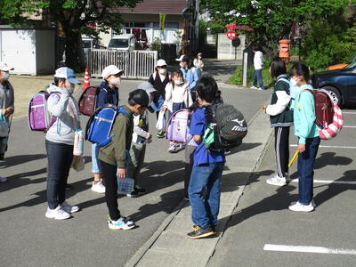 4月から取り組んでいることがあります。それは、登校班の解散の仕方です。1年生の昇降口まで、列を崩さず、しっかり歩いてくるよう伝え、最後にあいさつを交わして終わるよう指導しています。6年生には、「下の学年(特に1年生)を『しっかり送り届ける』」という意識を高め、下の学年には「6年生への感謝の気持ちを育てる」ことを目指しています。