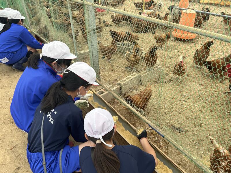 養鶏所に着いたら、早速えさやりを体験させていただきました。