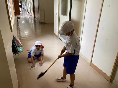 6年生の班長から順番に自己紹介をして、清掃の仕方と役割分担について確認した後、実際に清掃を行いました。