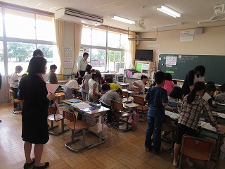 五校時目に、福島県教育庁義務教育課の先生を講師にお招きして、3年3組の授業研究会を行いました。学習したのは算数のわり算です。単純に計算するのではなく、問題の意味を考えて答えを求める場面でした。最初はどうやっていいかわからない子どもたち。でも、じっくり考え、友達と話し合ううちに問題の意味を理解し、解決することができました。友達と一緒に考え、学ぶことの大切さを確認することができた授業でした。3年3組さん、よくがんばりました。