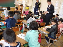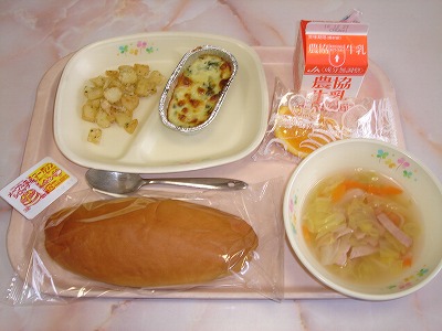 また、今日の給食のメニューはコッペパン、牛乳、メイプル風シロップ、ほうれん草グラタン、チーズポテト、白菜とコーンのスープ、オレンジでした。学期に1回のパンとそれにあわせたメニューで、しかもデザート付きの豪華給食でした。(おいしくて子どもたちも大喜びでした!)