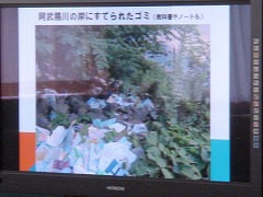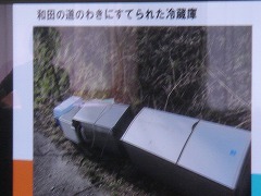下記の写真のように、市内の各地に不法投棄されている電化製品などの映像も見せてい
