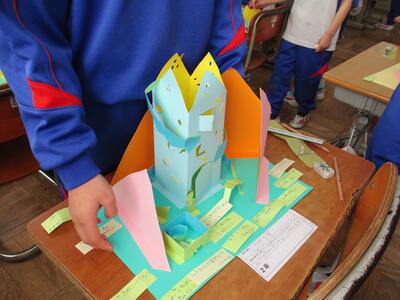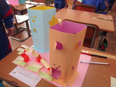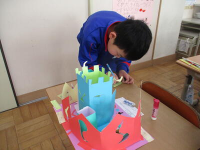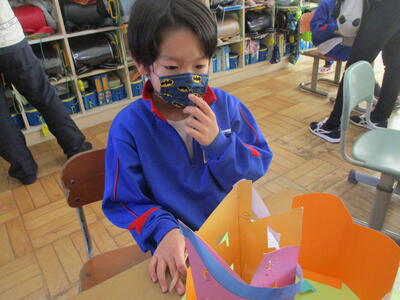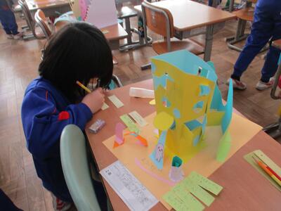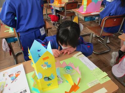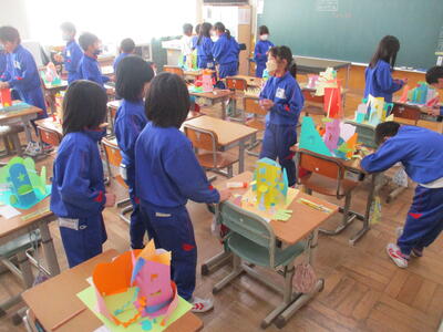 1月29日 図画工作科「めざせ!カッター名人」の作品が完成した2年生。