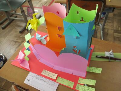 今日は、お互いに作品を鑑賞し合い、その作品のすてきなところを伝え合っていました。付箋にコメントを書き、台紙に貼っていきます。