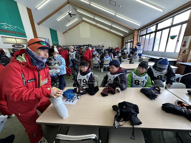 スキー靴の履き方も真剣に聞いていますね。
