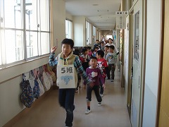 6年生の世話で並んできちんと移動中! 聴力の検査中です…