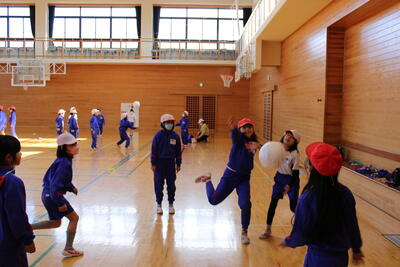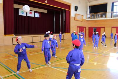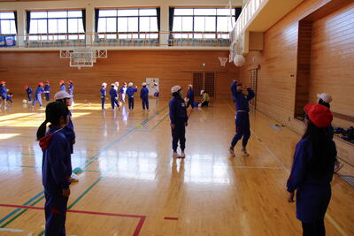 2024年1月23日 11時20分1月23日 体育科のソフトバレーで汗を流す3年生。今日は、レシーブの技術向上を目指して、グループごとに、地面に落とさずに何回続けられるかを競っていました。