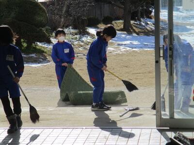 1月17日 業間の休み時間、3年生が昇降口のお掃除をしていました。雨や雪の日は、靴についた土や泥が床に落ちやすくなります。そんな汚れを当たり前のように掃除をする3年生。
