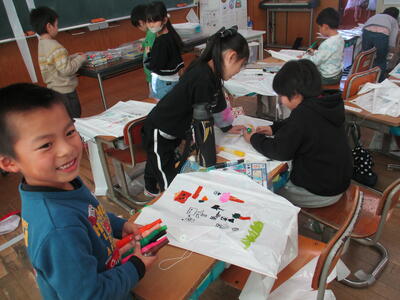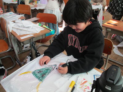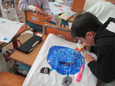 1月17日 1年生が生活科でたこ作りをしていました。生活科では、四季折々の遊びを通して、季節の移り変わりを体感的に学んできます。というわけで、今日は、たこにデザインを描いていました。