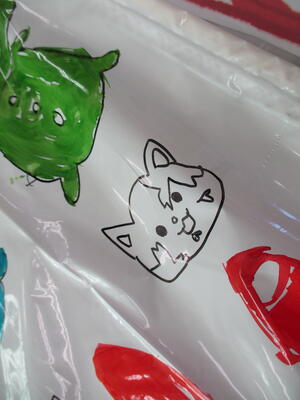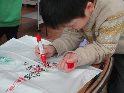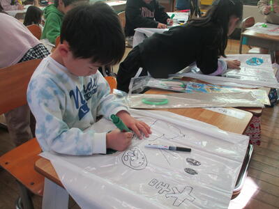 最初は同じ形でも、そこに自分が描きたい絵を描けば、あっという間に「わたしの たこ」に生まれ変わります。思い思いに絵を描く活動を楽しんでいました。