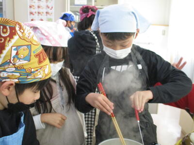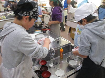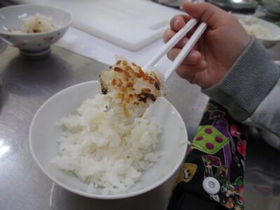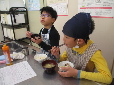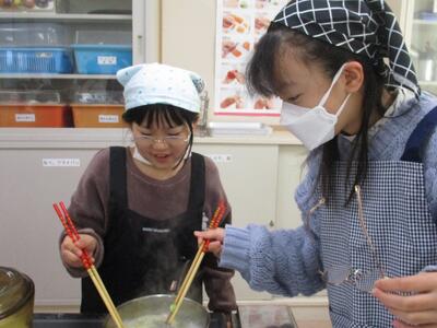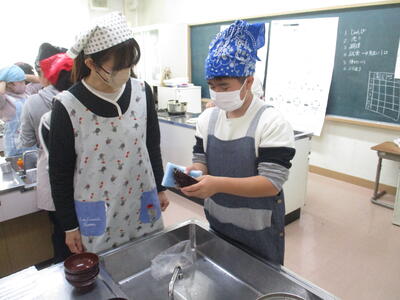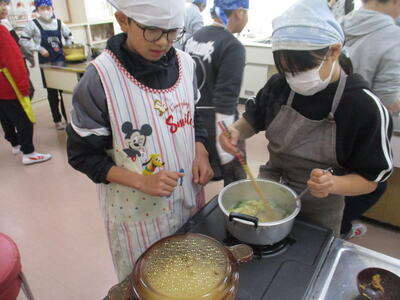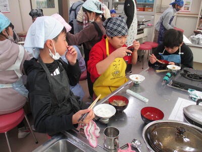互いに教え会いながら、手際よくあっという間に調理実習を進めた5年生。この後の片付けも素早かったです。学級のチームワークのよさが伺えました。