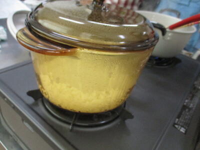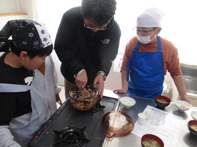 今回のメニューはごはんと味噌汁です。ごはんは、ガラス鍋を使って炊きます。炊き上がっていく過程を確認するためです。味噌汁は煮干しで出汁を取っていました。これもまた大切な学習です。