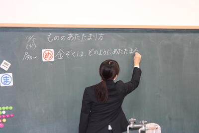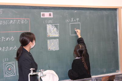 子どもたちと話し合いながら、実験しないとわからないという「学び心」を高め、学習課題を黒板に書きます。