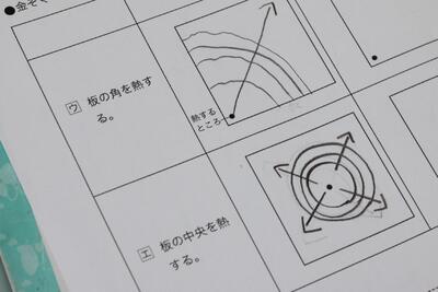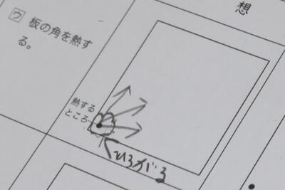 予想を書きながら「じんわり広がると思う」とつぶやく子がいました。ああ、なんとすばらしい!教科書には「じんわり」とは表現されていないのですが、熱伝導の感覚を小学4年生なりの言語感覚で表現していました。