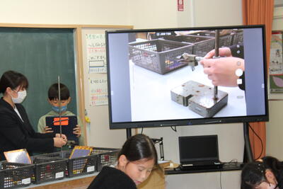 先生は実験の手順を大型モニターを使って演示しました。視覚補助は、全体の理解を一気に深めるので効率的に時間を使えます。